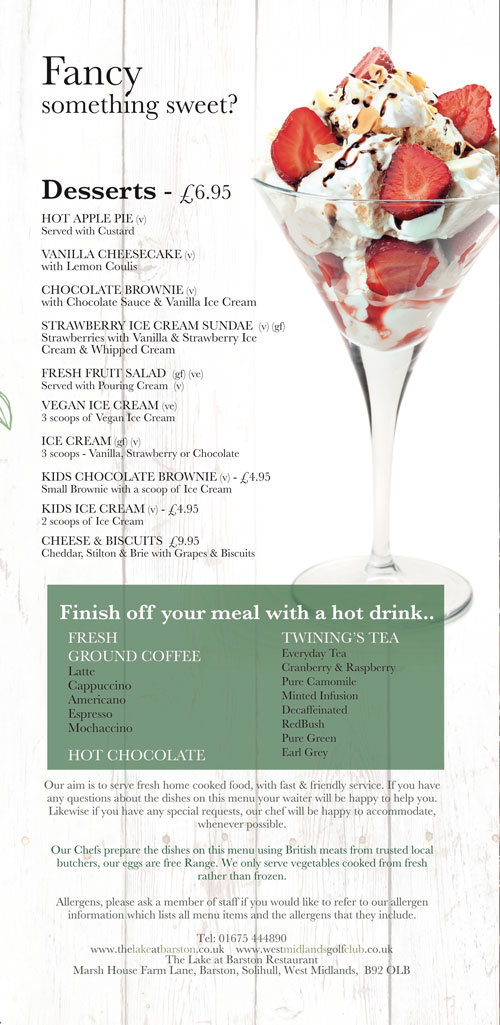 The Lake at Barston Restaurant is at the West Midlands Golf Club, in Barston, Solihull. It is just a few minutes from the NEC and Resorts World.