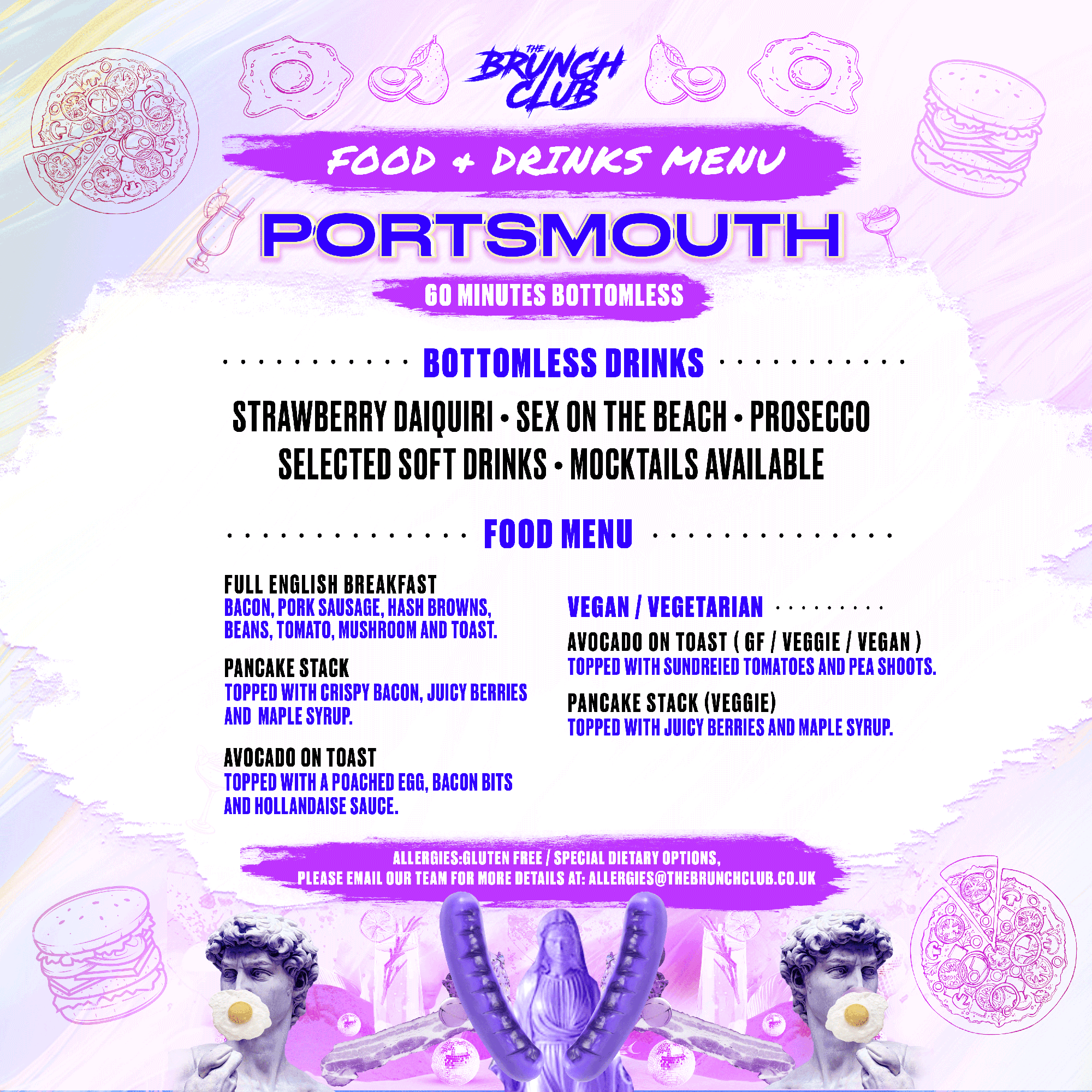Food orders must be correctly submitted on checkout. Your food orders cannot be changed at a later date and your order submission is final. Due to the volume of food orders we can't adapt, amend or change any meal dishes in advance or on the day. If you have an allergy, please select this option on checkout and email your allergy to us at: allergies@thebrunchclub.co.uk - one of our team will then respond accordingly/ make a note of it for the relevant venue you're attending.